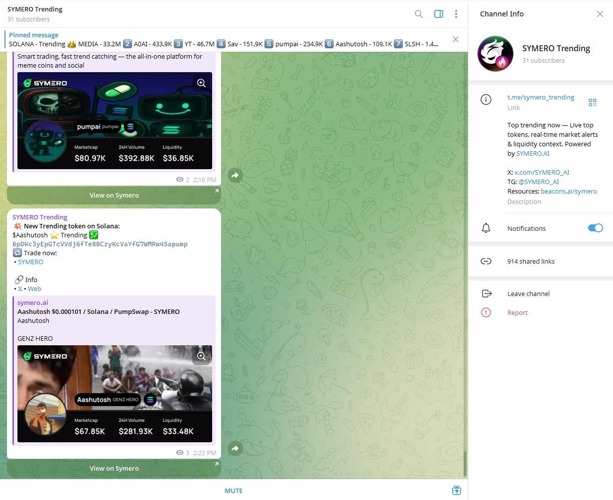 β Stay Ahead β Spot new trending tokens before they peak. β Data-Backed Alerts β Context with market cap, volume, and liquidity. β Seamless Trading β Jump from Telegram alert straight into SYMERO.AI β Community Flow β Ride alongside other degens watching the same momentum.